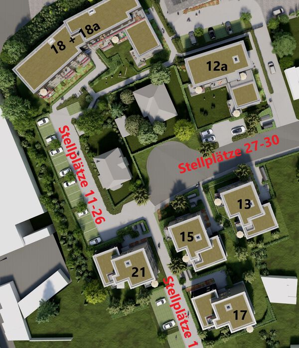 10 Stellplätze davon liegen westlich des Wohngebäudes Nr.17. Zwischen Wohngebäude Nr. 21 und Wohngebäude 18 liegen 16 Stellplätze und die restlichen 4 Stellplätze befinden sich vor dem Wohngebäude Nr.12a.